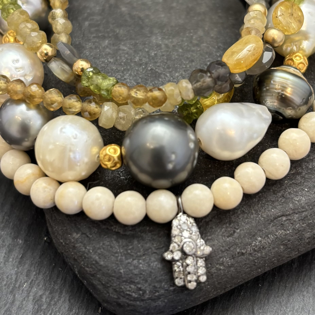 This Lovely Diamond Hamsa symbolizes Protection and prosperity. Stung with Lovely River Rock, and clasped with sterling silver…this makes for an everyday wear. Alone or layered up! 7.5″ Long