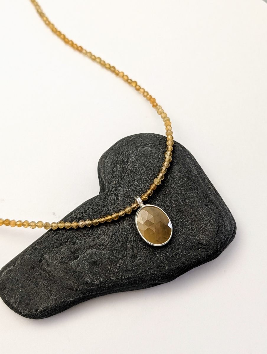 Sunny Yellow Sapphire Pendant hangs from these lovely 4mm Round Faceted Green Garnets.